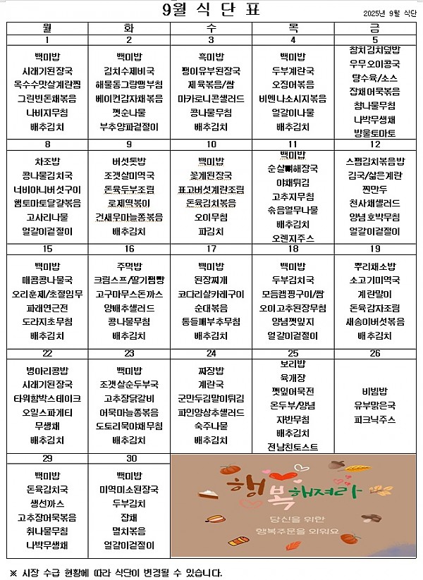2025년 9월 식단표 ^^ 페이지 정보 작성자 관리자 작성일25-08-28 18:17 조회199회 댓글0건 이전글 다음글 목록 본문 처서가 지났지만 아직 무더위가 기승을 부리고 있습니다. 9월에도 맛있게 먹고 힘내서 즐겁게 일하겠습니다. 이전글 다음글 목록