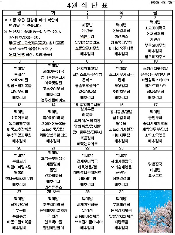 2026년 4월 식단표 ^^ 페이지 정보 작성자 관리자 작성일26-03-31 16:13 조회25회 댓글0건 이전글 다음글 목록 본문 꽃이 완연하게 피는 따뜻한 4월입니다. ^^ 좋은 재료로 만든 맛있는 음식을 잘 먹고 건강하게 생활하겠습니다. 이전글 다음글 목록